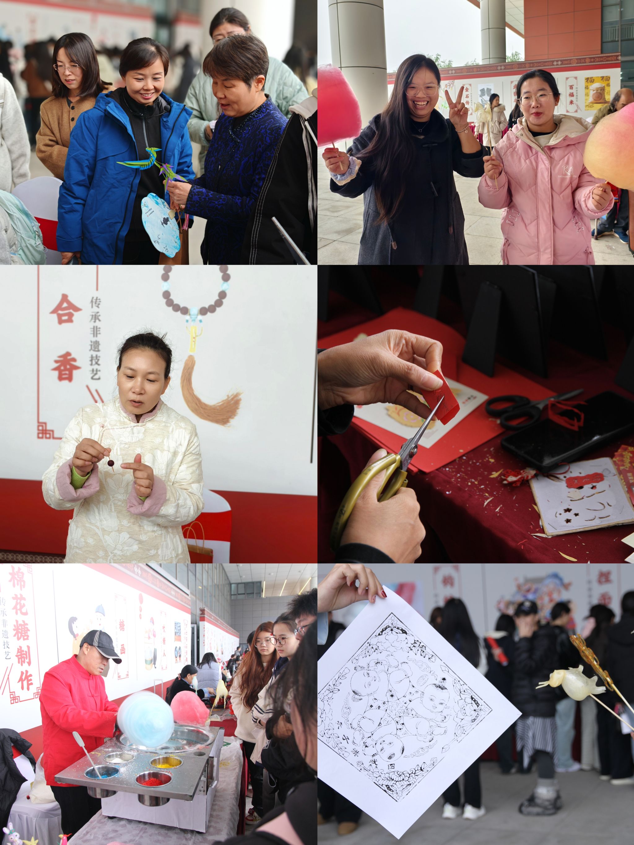 游园会特邀众多非遗传承人亲临现场,通过技艺演示、互动教学与沉浸式体验,带领师生近距离感受非遗魅力,并亲手制作了独具特色的非遗作品。活动现场特设“王丽云剪纸技术技能大师工作室”“方士英石影雕技术技能大师工作室”展位,更有捏面人、绳结技艺、吹糖人、糖画、珠编、名字画、柳沟草编、微雕、葫芦烙画、钩编技艺、棉花糖、鲁班锁制作、绒花制作、掐丝珐琅、扎染、漆扇、金石传拓、武强年画、中药香囊制作、合香、百福米、金箔画制作、螺钿技艺、宋锦发夹制作、冰糖葫芦等三十项非遗体验同步开展,生动呈现传统工艺的多样风采。