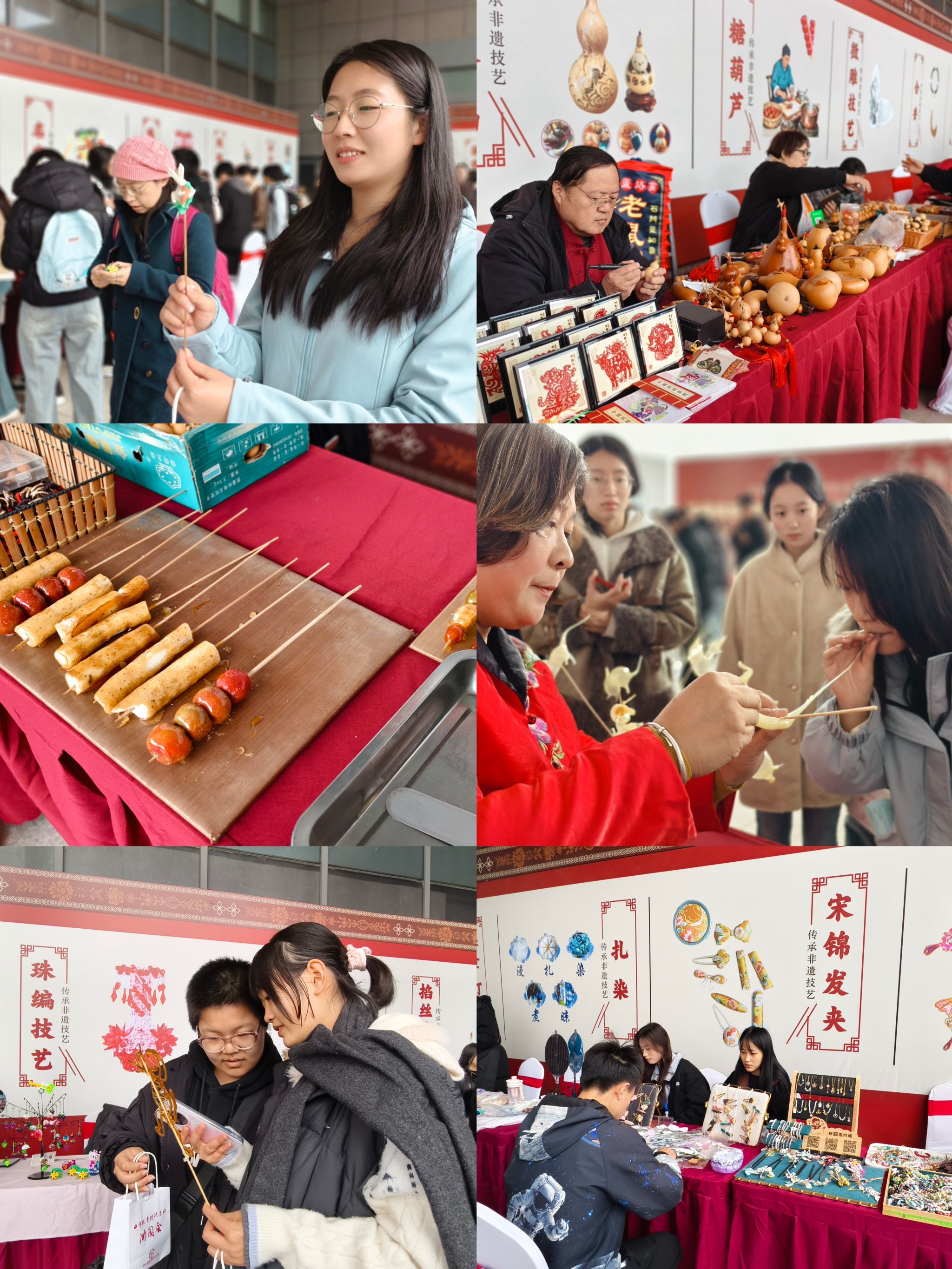 来自传媒艺术系2024级数字媒体技术4班的张奋乐同学说:“这次游园会让我真切感受到了非遗文化的鲜活与魅力。以前只在书本上见过微雕、掐丝镶嵌,今天竟然能亲眼看到传承人老师现场演示,甚至手把手教我们创作。我尝试了扎染和糖画制作,从捆扎到染色,每一道工序都蕴含着匠人的巧思与耐心。”经济贸易系2024级电子商务5班的郭瑞鑫说:“这次活动不仅让我学会了技艺,更让我体会到‘守艺’背后的坚守与热爱,我们年轻一代也应当成为非遗传承的星星之火。”软件工程系辅导员赵卜丽老师全程参与,体验了多个非遗项目,她表示:“这场游园会是一次非遗教育与美育实践的深度融合。许多学生通过捏面人、草编等互动,自发探究起民俗背后的历史渊源与地域特色。”