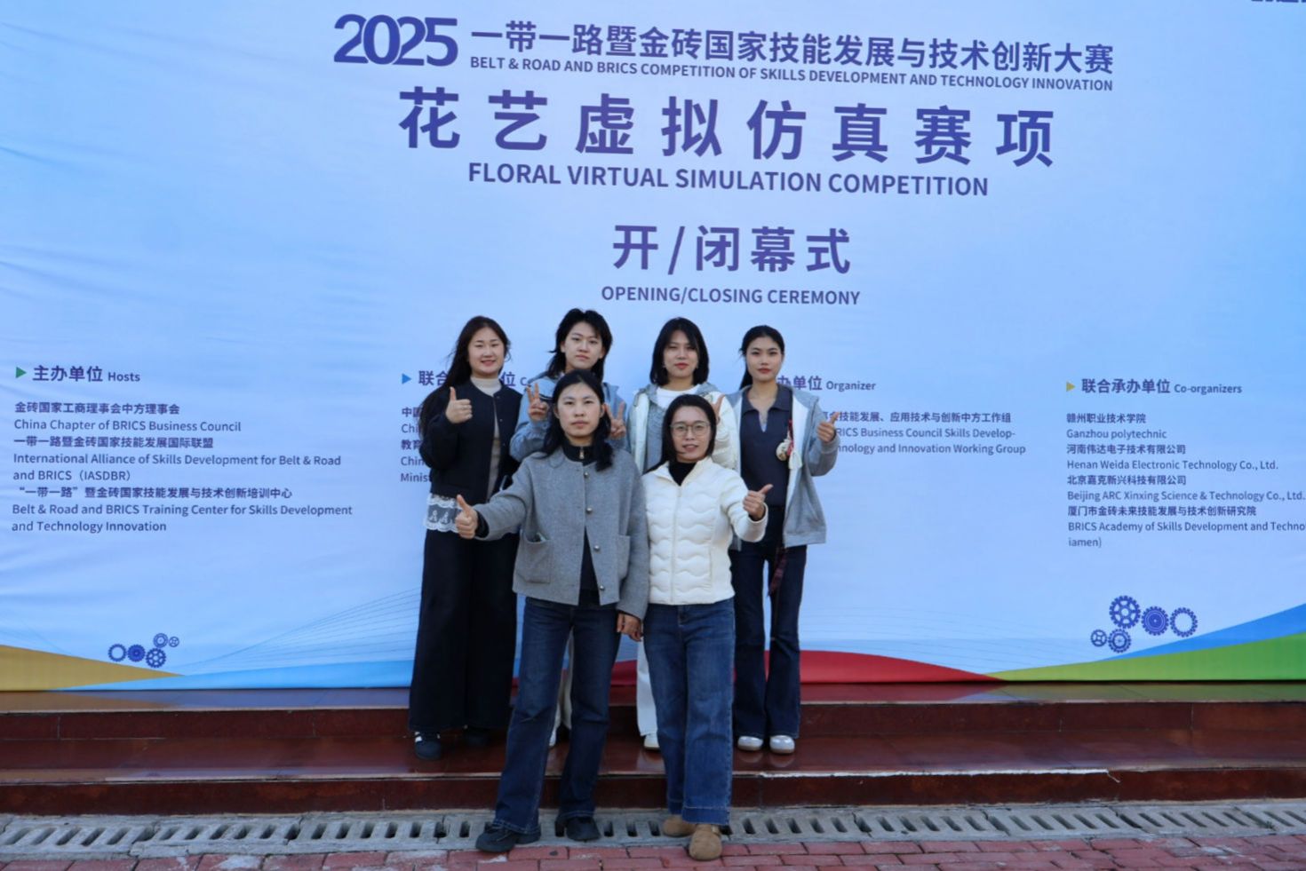11月23日,2025一带一路暨金砖国家技能发展与技术创新大赛花艺虚拟仿真赛项(高职组)在赣州职业技术拼搏(中国)顺利举行。我院农林牧医系园林技术专业学生鲁婧媛、汤鑫蕊、王梓茜、赵宇萌(指导教师董彦娜、姚君君)组成的两支参赛团队发挥出色,分别荣获全国二等奖、三等奖奖,我院荣获优秀组织奖。
