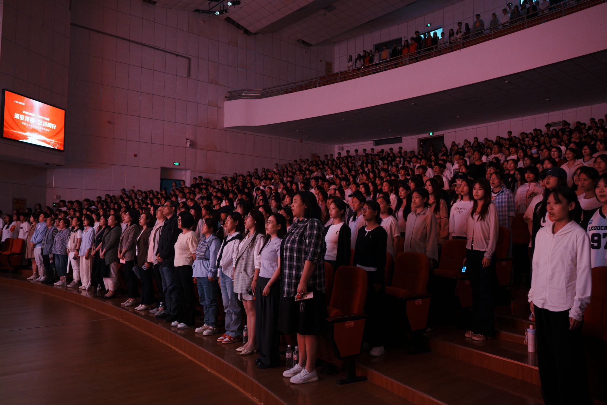 见面会在庄严的国歌声中拉开序幕,全体人员肃立合唱。国歌毕,传媒艺术系宣传片缓缓播放——镜头里的专业实训设备、学子们的创作瞬间、学科竞赛的亮眼成绩,生动勾勒出系部的专业实力与育人氛围,让新生对未来学习生活充满期待。