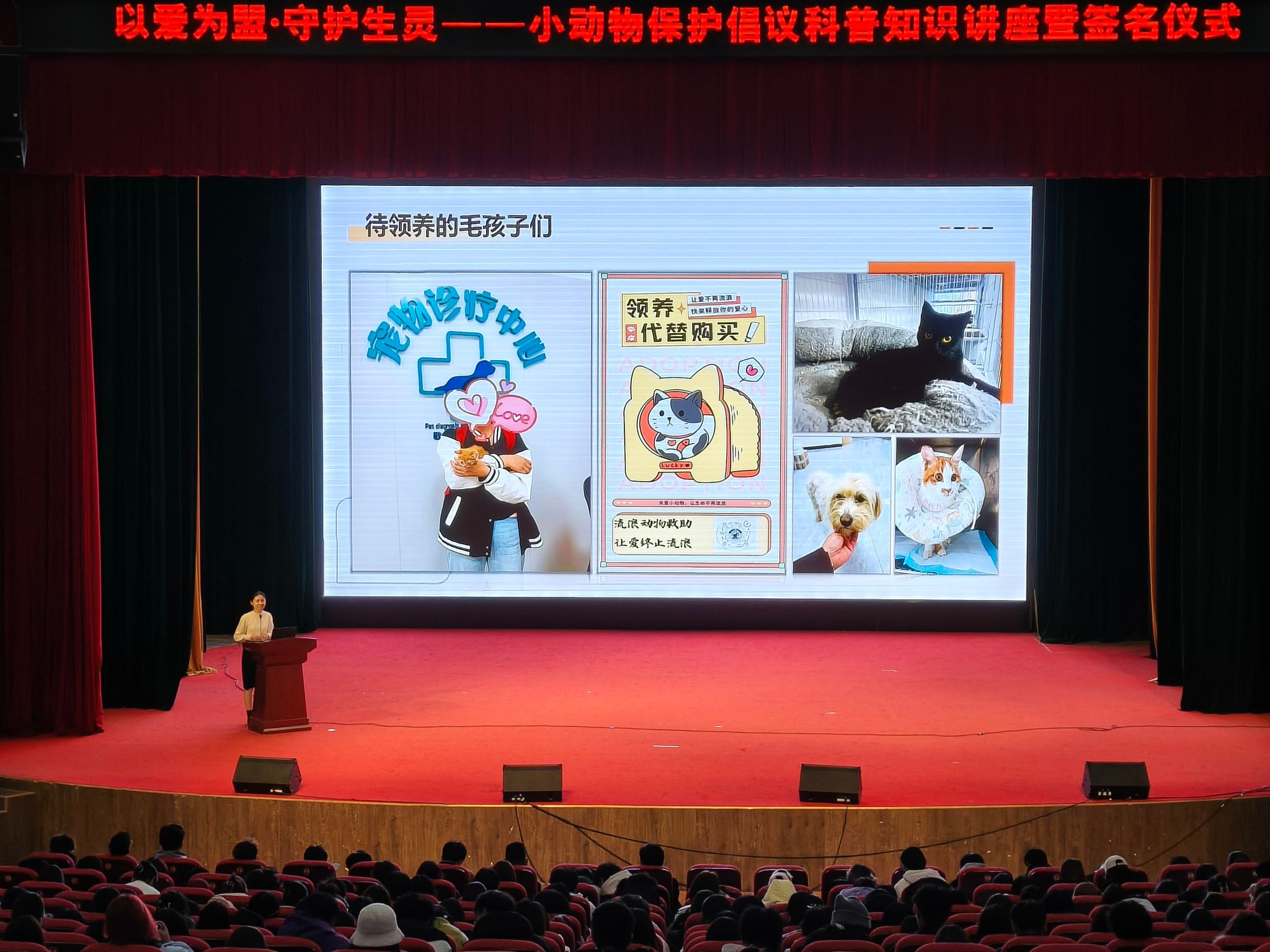 科普讲座结束后,由爱心动医社的丁子妍、汲盈琪两位同学以“领养代替购买,让爱不再流浪”为题分享了救助案例。