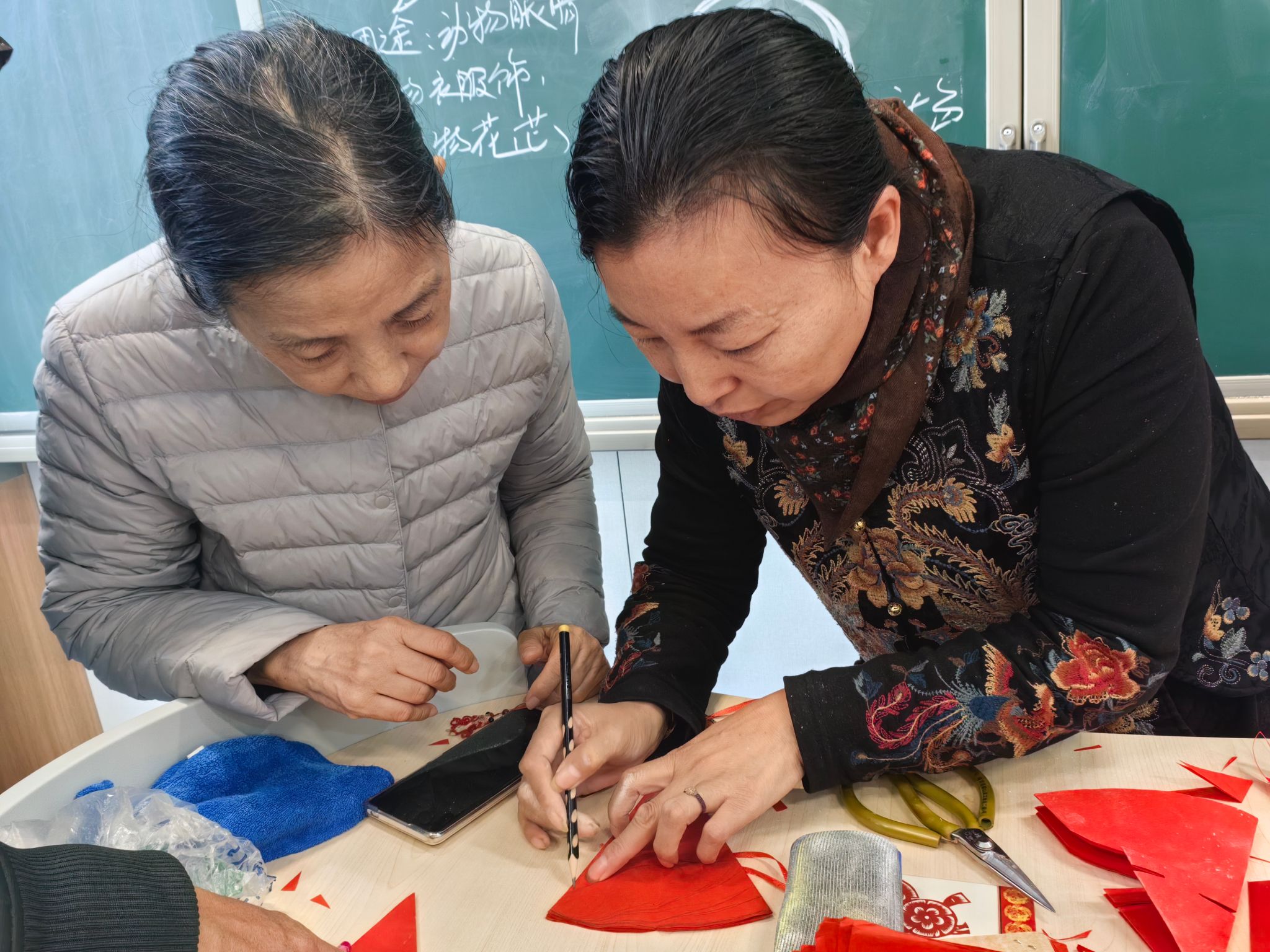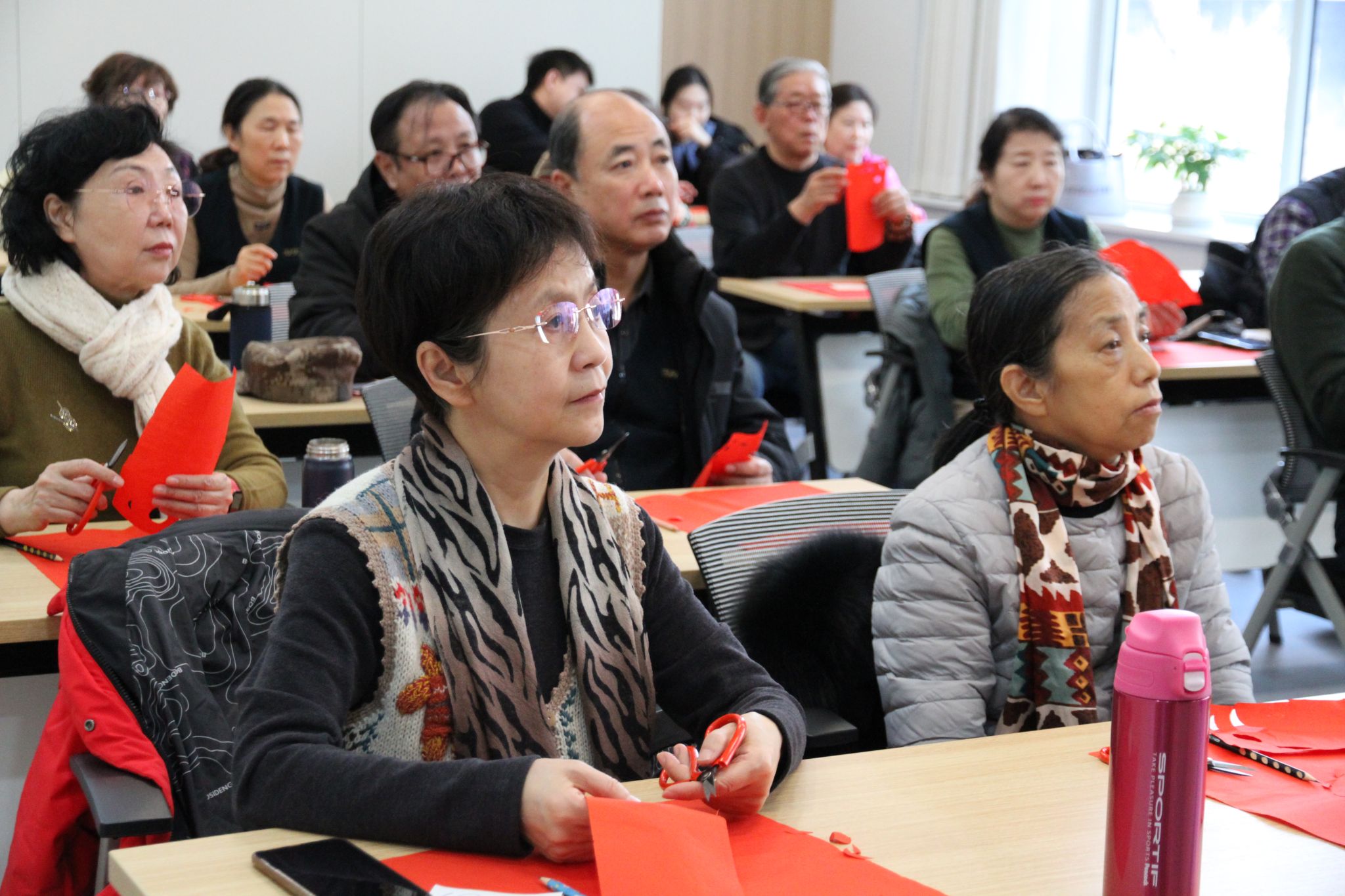 活动现场,王丽云老师亲自授课,从剪纸的历史渊源、基础纹样技法到创意构图方法,为学员们进行细致讲解。针对老年学员的学习特点,她特意选取了寓意吉祥的团花、福字等简易纹样,手把手示范“折、叠、裁、剪”等核心技巧,耐心纠正大家的操作细节。
