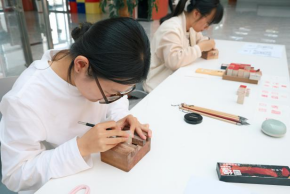 展厅内墨香四溢,吸引了众多师生驻足观赏。现场设有互动区,书法社骨干成员现场挥毫示范,演示着软笔、硬笔和篆刻技巧,指导老师细致指导,让同学们学习书法知识。